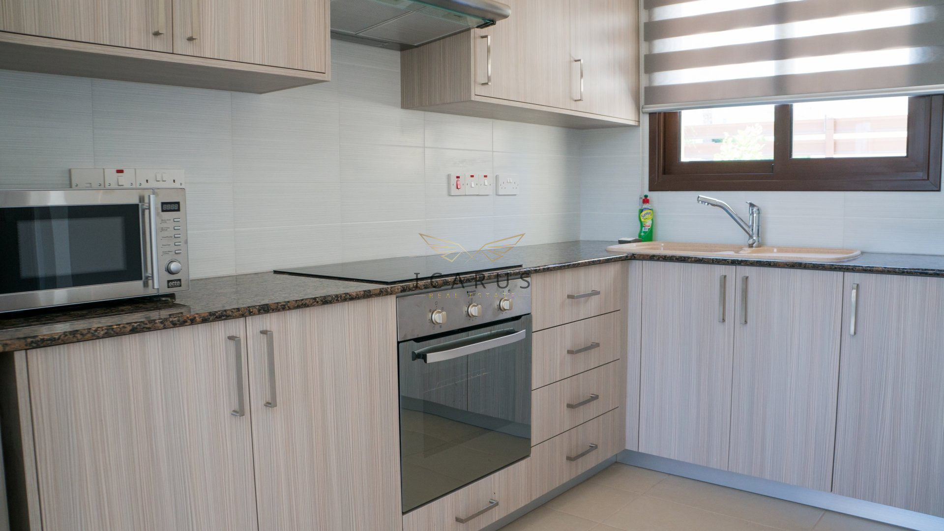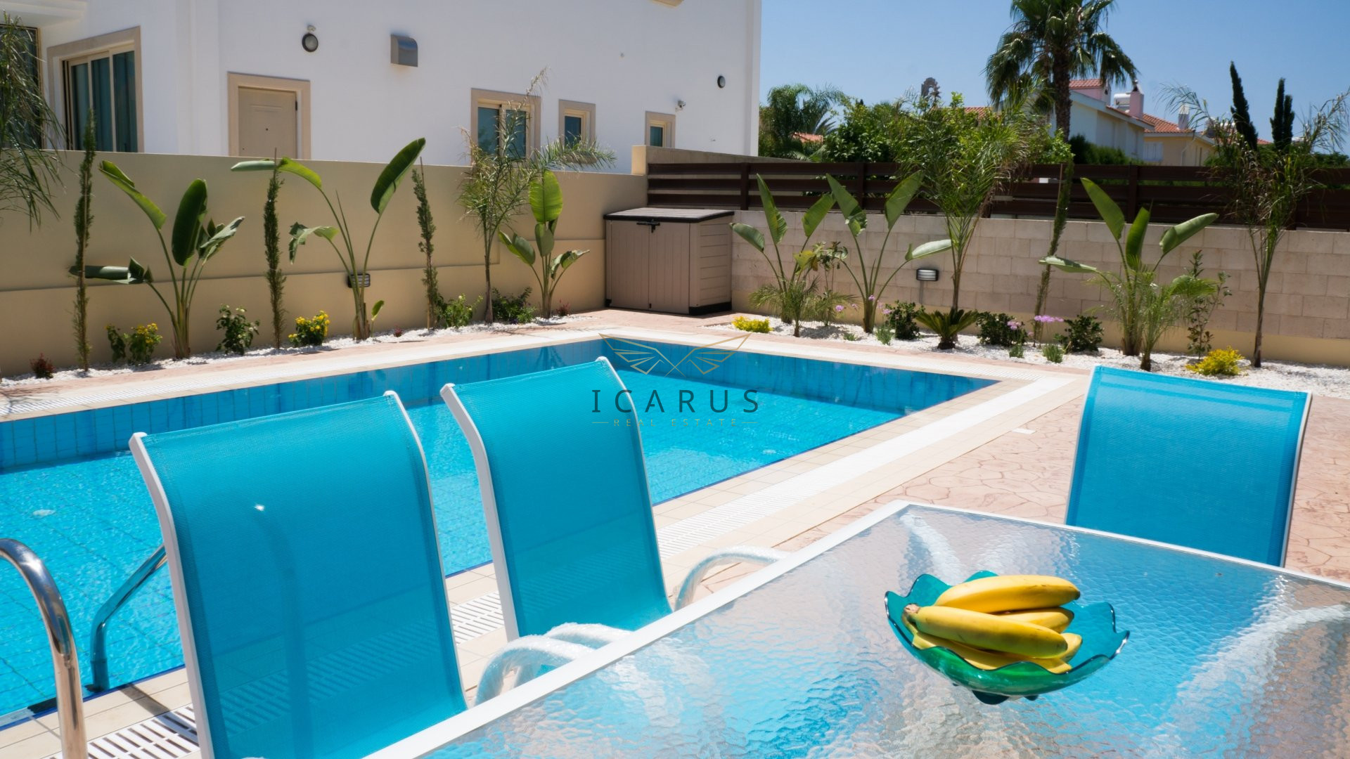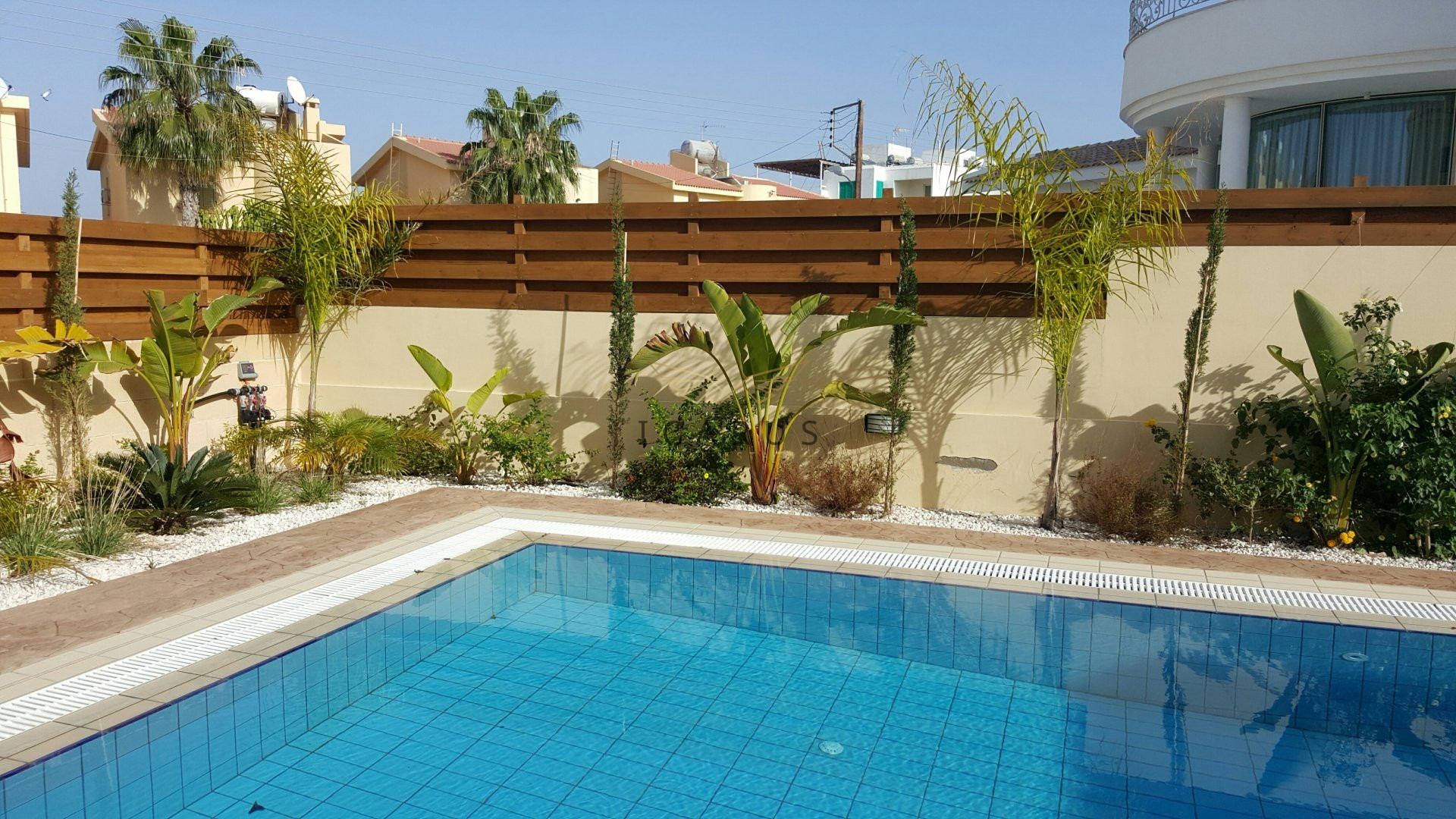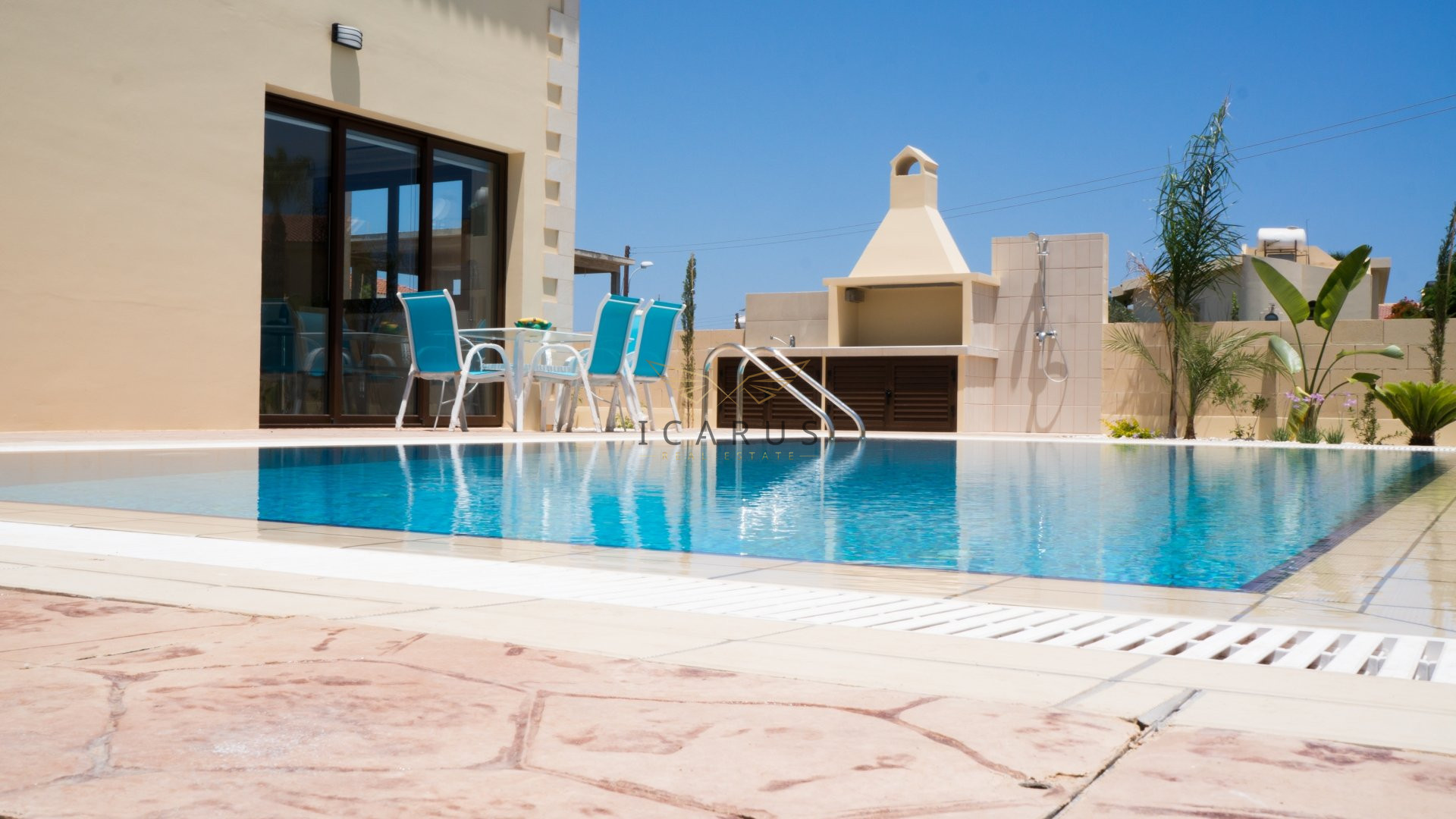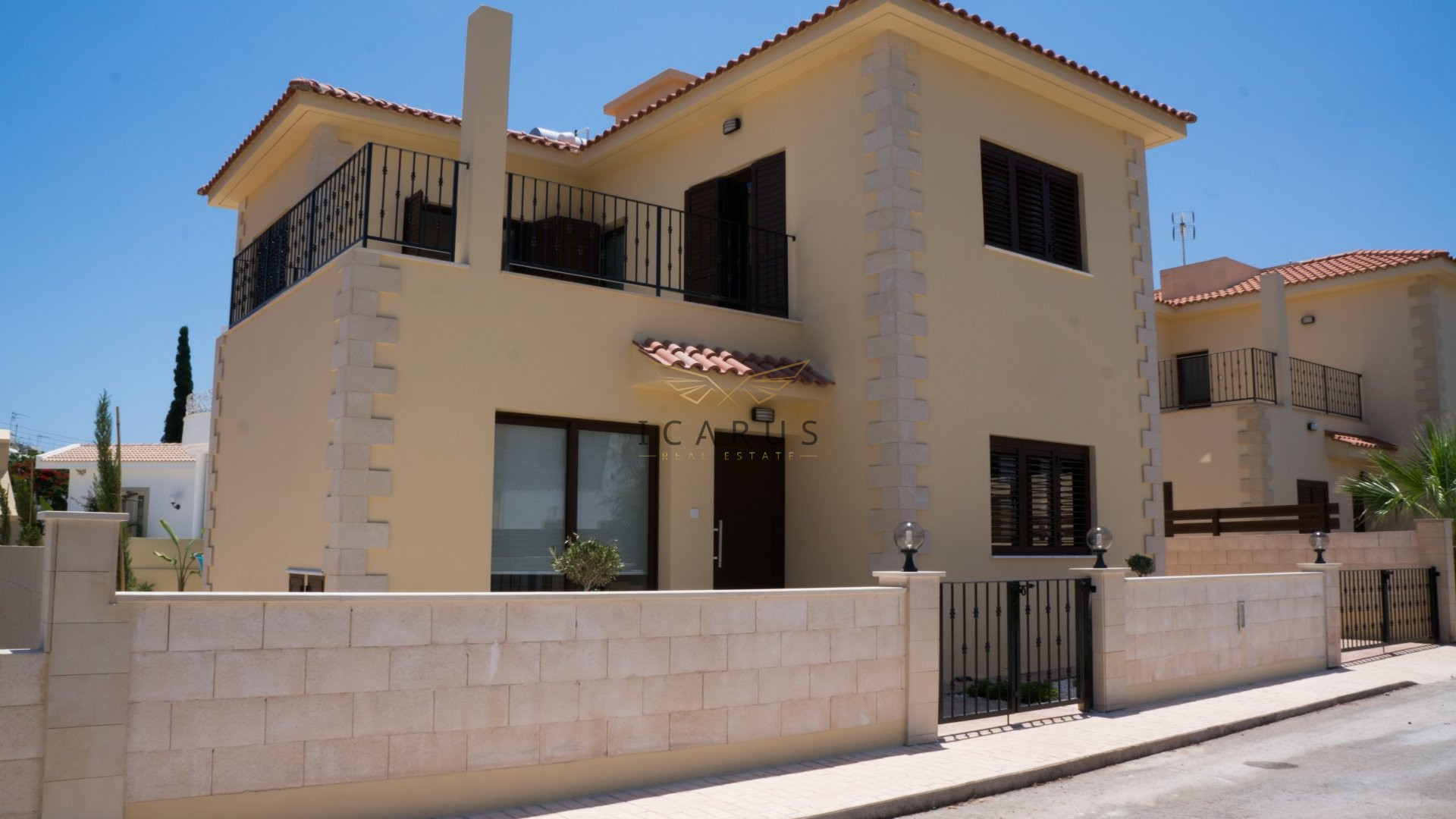 This lovely newly built three bedroom villa is located in Sirena Bay, very famous sandy beach in Protaras. The villa is only 95 m away from the sea.Upon entering the villa you find yourself in an open plan living room, dining area and kitchen. In the living room there is flat screen TV with satellite channels. the twin bedroom is also on the ground floor, as well as guest WC with a shower. Upstairs there are the other two bedrooms and a family bathroom with a hot tub. There is very spacious terrace upstairs with a little bit of a sea view